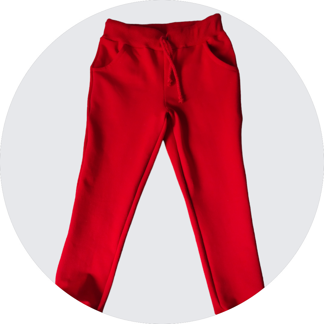 Spodnie dziecięce wykonane z dresówki petelki, wykończone ściagaczem w kolorze czerwonym.